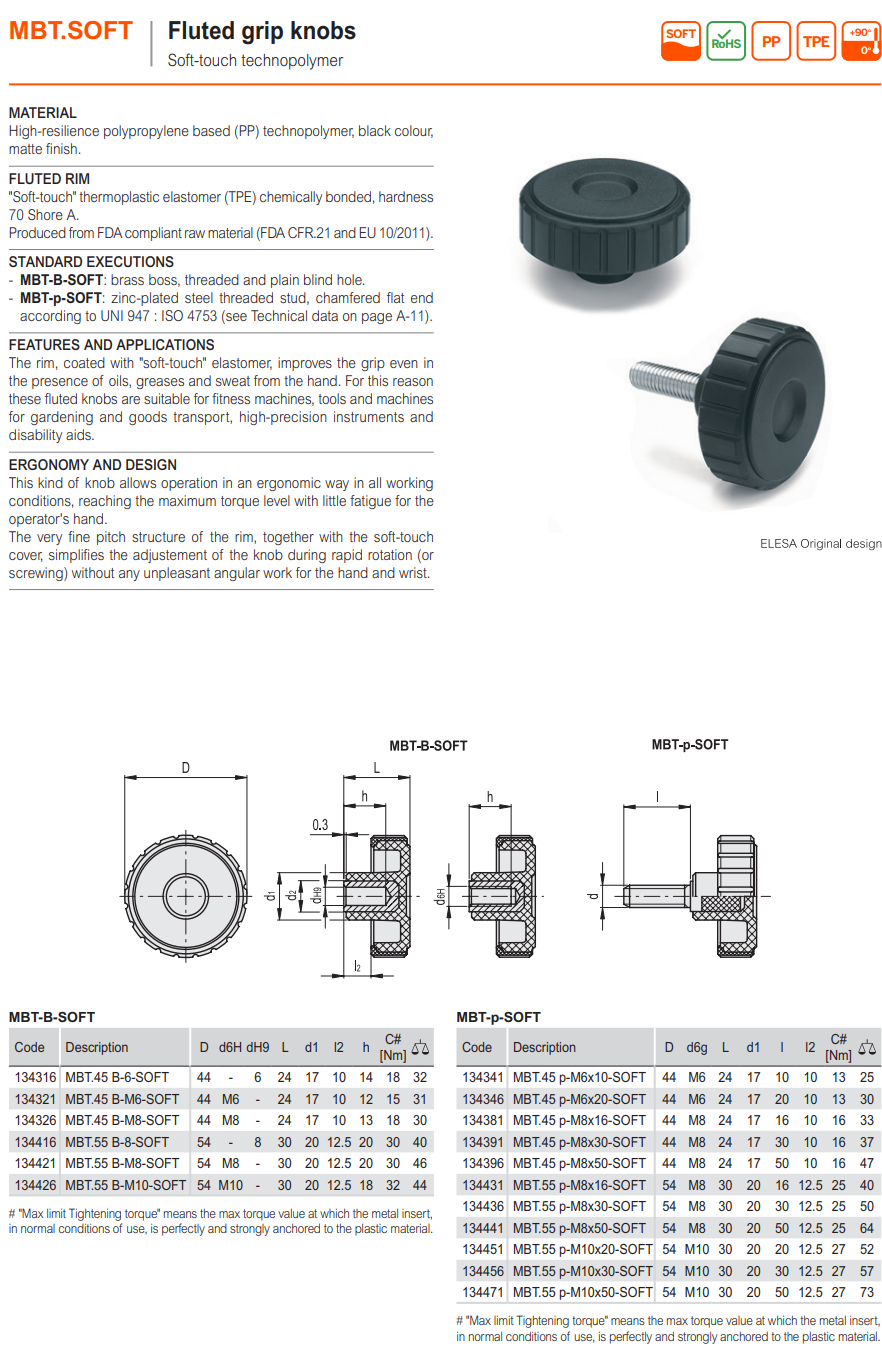MBT-p-SOFT 홈이 있는 노브 (부드러운 감촉, 아연도금 스틸 나사산 스터드)