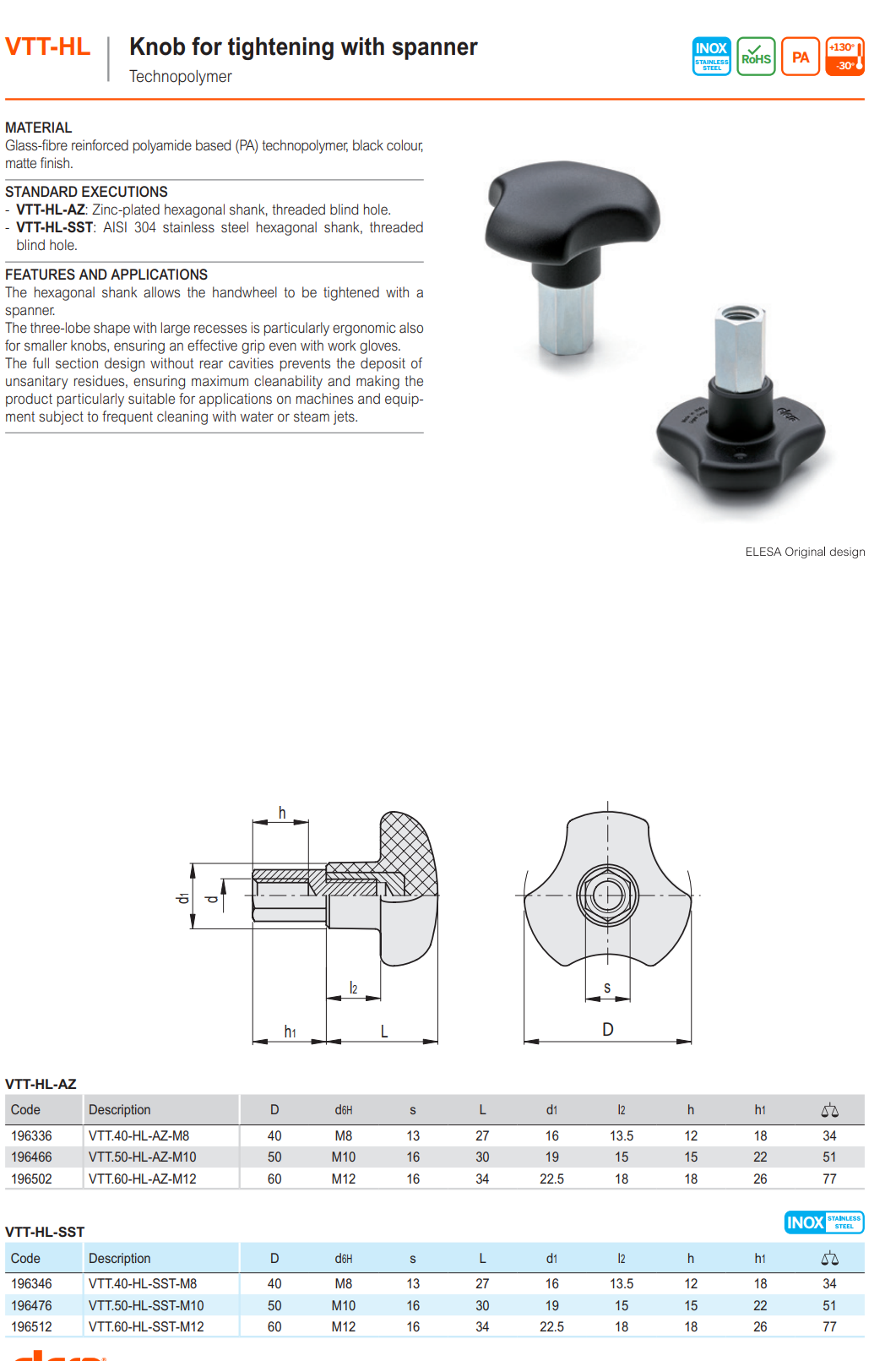 VTT-HL-SST 나사산 스패너 노브 (AISI304 스테인리스 육각)