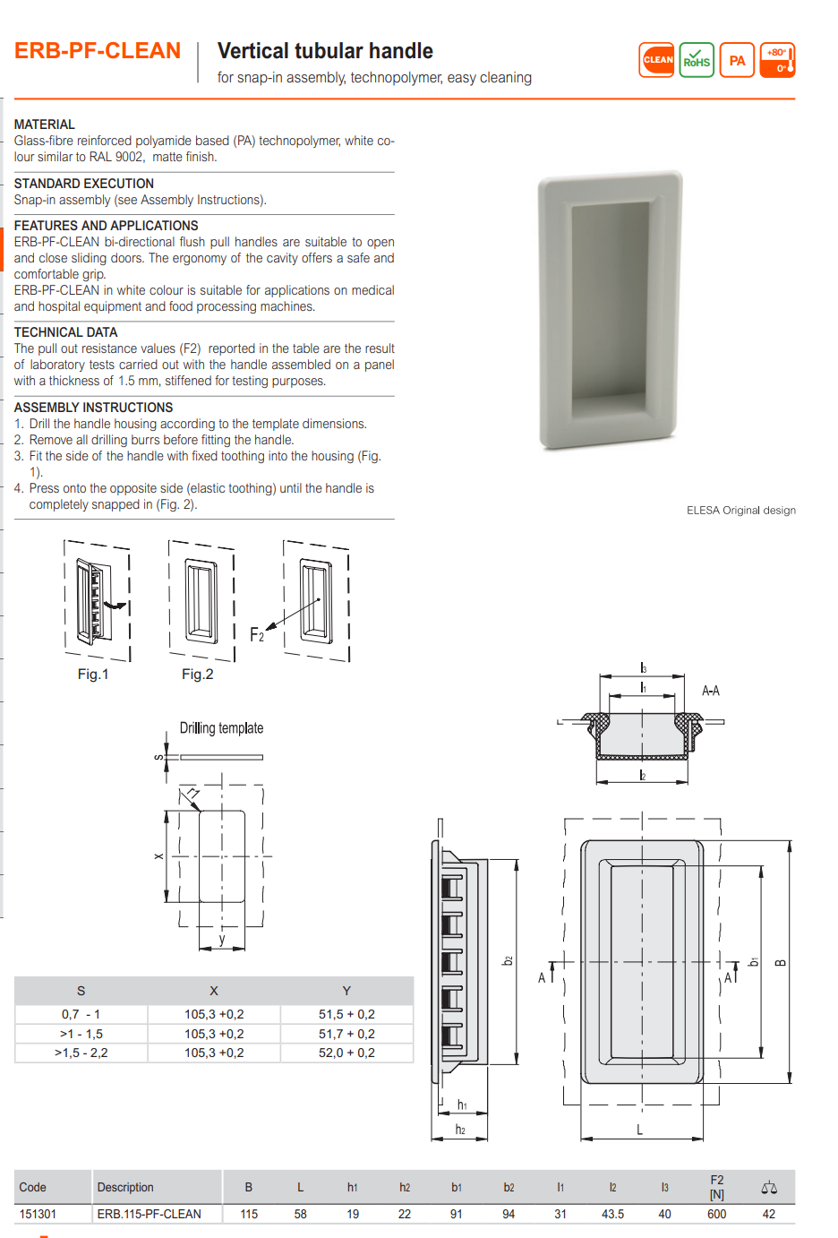 ERB-PF-CLEAN 매립손잡이 (삽입형, 수직설치형, 방진제품, 테크노폴리머) / 5개입