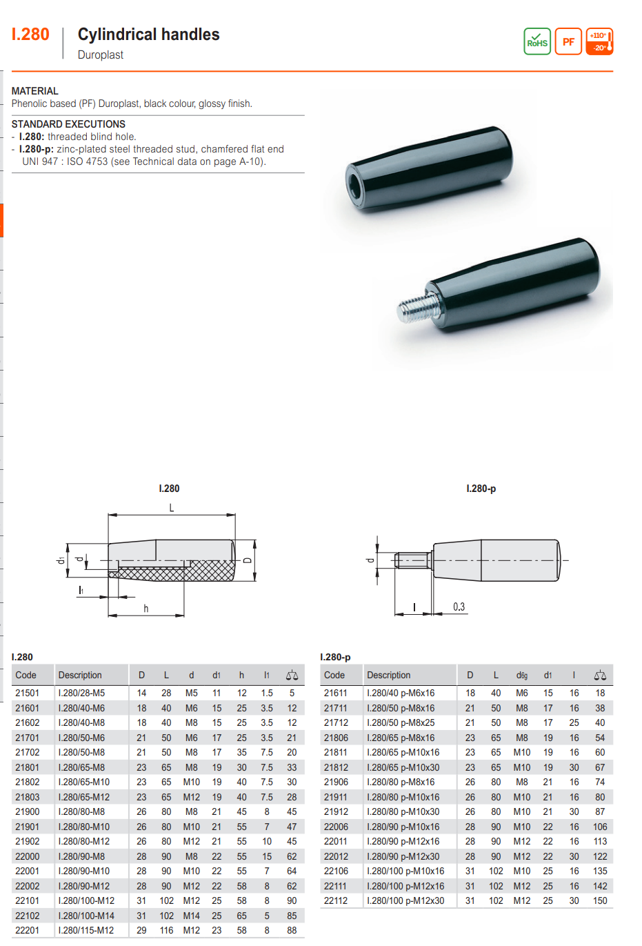 I.280 고정 핸들 (듀로플라스틱, 원통형, 암나사)
