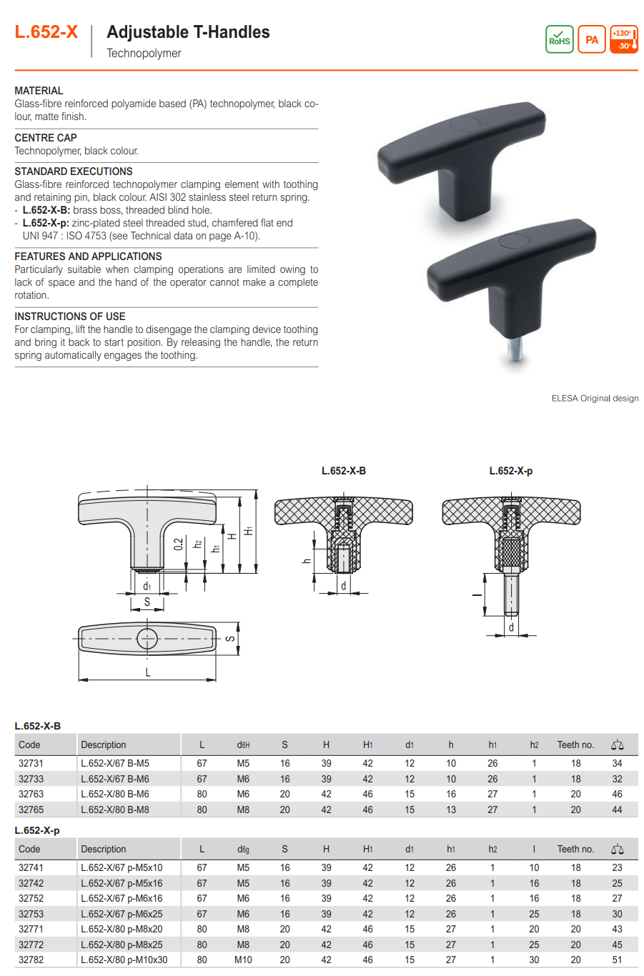 L.652-X-B T핸들 (암나사, 조절가능, PUSH 타입)
