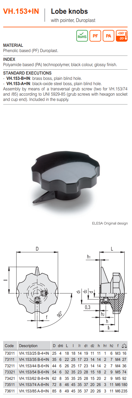 VH.153-B+IN 로브 노브 (지시 표시 있음, 듀로플라스틱, 플랜지타입, 황동보스, 관통홀)