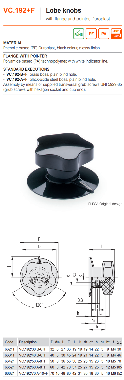 VC.192+F 로브 노브 (지시 표시 있음, 듀로플라스틱, 플랜지타입, 황동보스, 관통홀)