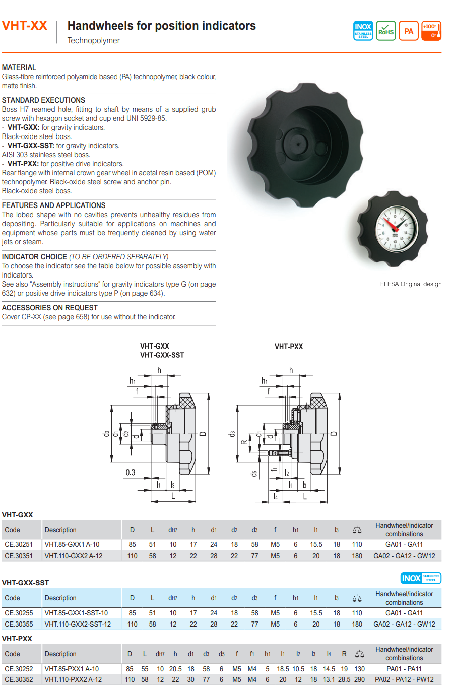 VHT-GXX-SST 포지션 인디케이터 용 노브형 핸드휠 (중력, 스테인리스 보스)