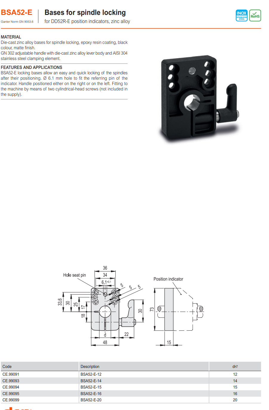 BSA52-E 스핀들 잠금 장치용 베이스 (DD52R-E인디케이터 용)