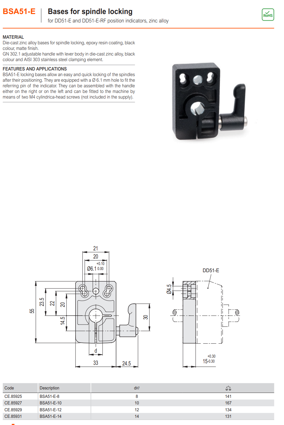 BSA51-E 스핀들 잠금 장치용 베이스 (DD51-E, DD51-E-RF 인디케이터 용)