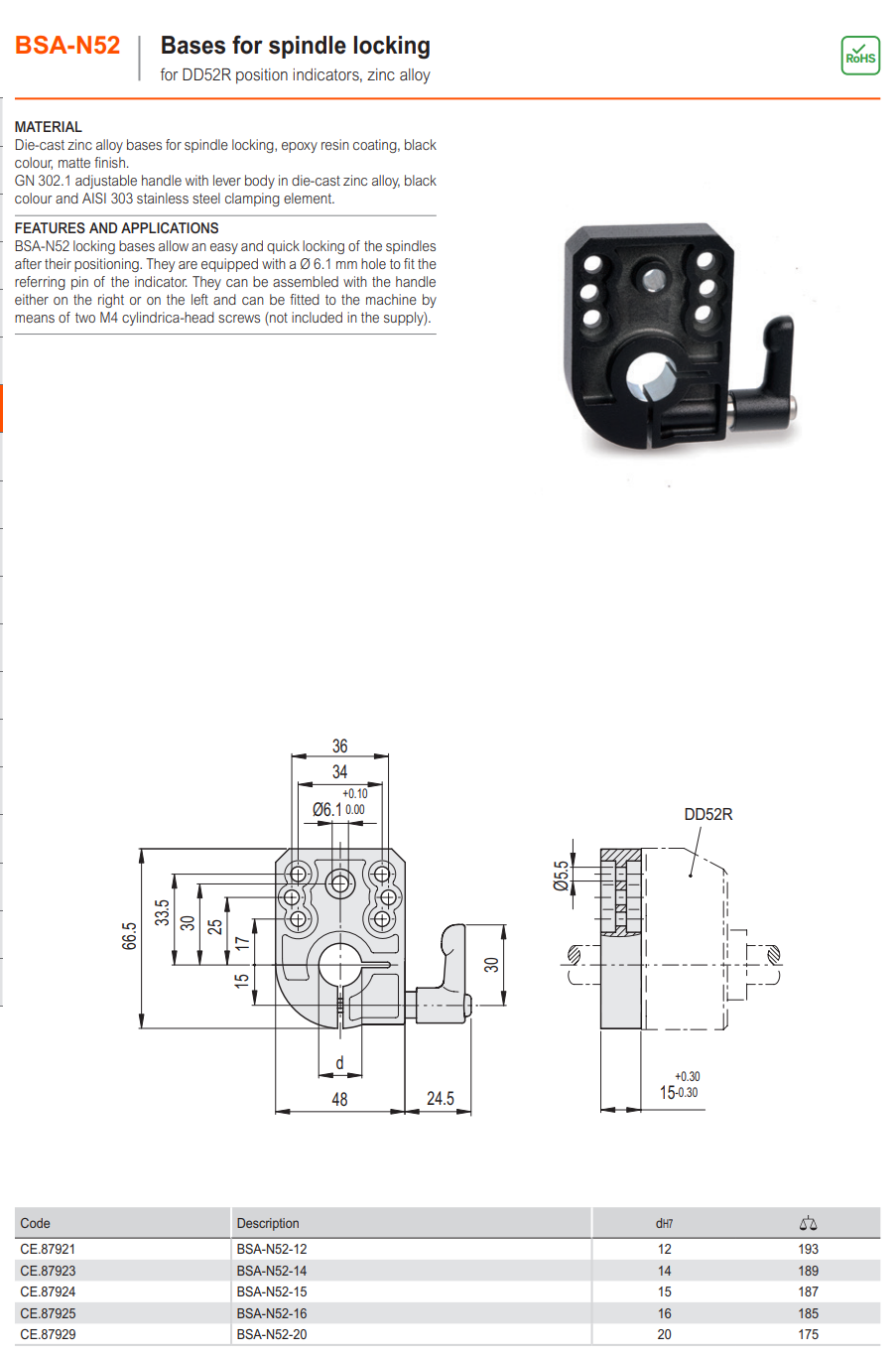 BSA-N52 스핀들 잠금 장치용 베이스 (DD52R 인디케이터 용)