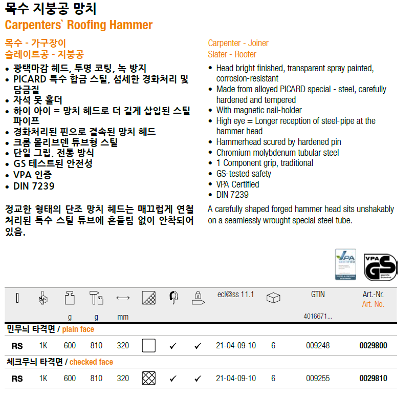경화 처리된 특수 합금강을 단조한 뒤 매끈하게 마감했습니다. 연장된 튜브형 샤프트가 상부를 단단히 잡아 주어, 타격 시 추가적인 보호 역할을 하며 지레처럼 사용할 때도 더 안정적인 퍼포먼스를 제공합니다. 못 홀더에는 매우 강력한 자석이 사용되었으며, 선택 사양으로는 추가 잠금핀과 2종 소재가 결합된 손잡이가 있습니다.